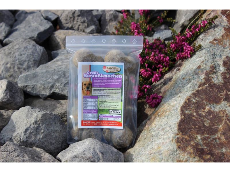 PANYS große Straussenknochen gibt es im praktischen wieder erschließbaren Beutel. Zwei große Straussenknochen pro Verpackungseinheit.